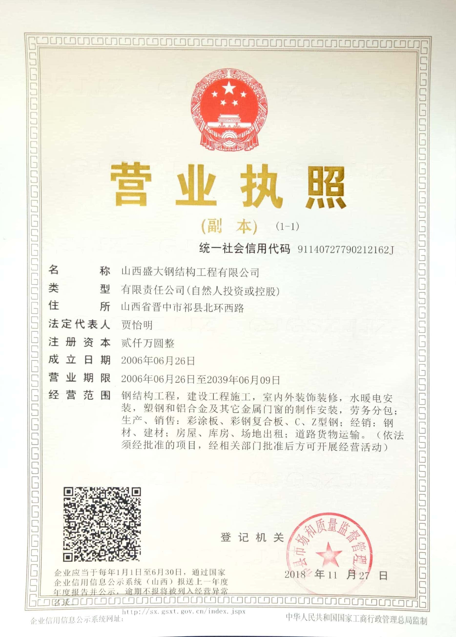 山西盛大鋼結(jié)構(gòu)工程有限公司 山西盛大鋼結(jié)構(gòu)工程有限公司成立于1996年,坐落于國家歷史文化名城——山西祁縣。擁有兩大智能化鋼結(jié)構(gòu)生產(chǎn)基地,占地110畝,建筑面積3萬余平方米,具備鋼結(jié)構(gòu)專業(yè)承包貳級(jí)、建筑工程施工總承包貳級(jí)資質(zhì),是一家集設(shè)計(jì)、制造、施工于一體的大型鋼結(jié)構(gòu)工程企業(yè)。 盛大鋼構(gòu)是中國鋼結(jié)構(gòu)協(xié)會(huì)會(huì)員單位,山西鋼結(jié)構(gòu)協(xié)會(huì)副會(huì)長單位,山西建筑企業(yè)商會(huì)理事單位,山西省土木建筑學(xué)會(huì)會(huì)員單位,擁有國家知識(shí)產(chǎn)權(quán)局注冊(cè)商標(biāo)。公司已通過ISO9001質(zhì)量管理體系認(rèn)證,體系覆蓋鋼結(jié)構(gòu)加工與施工等核心… more +